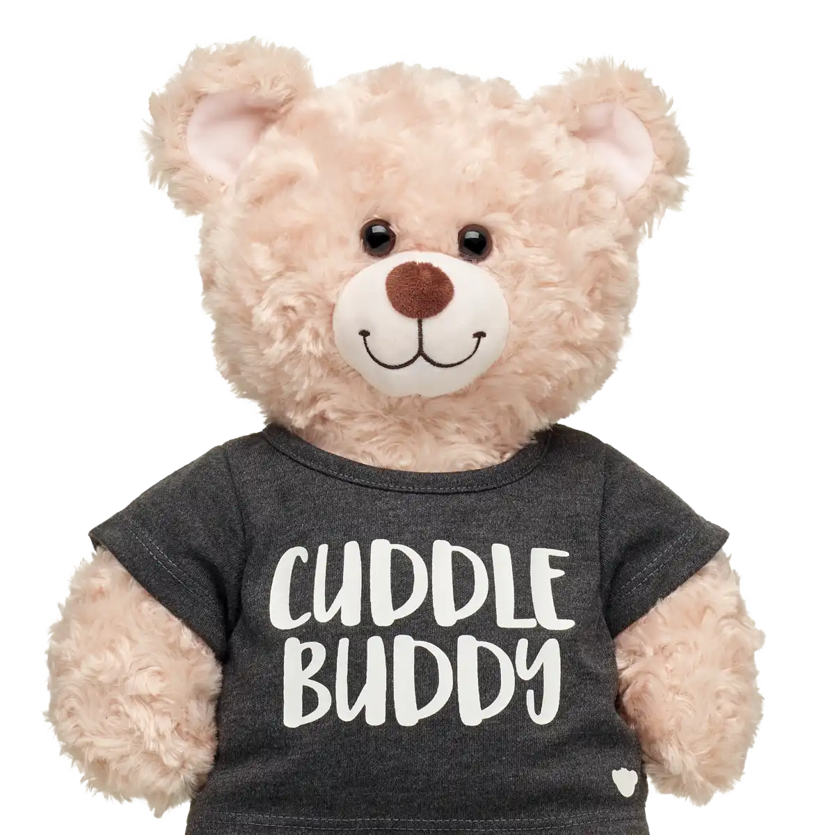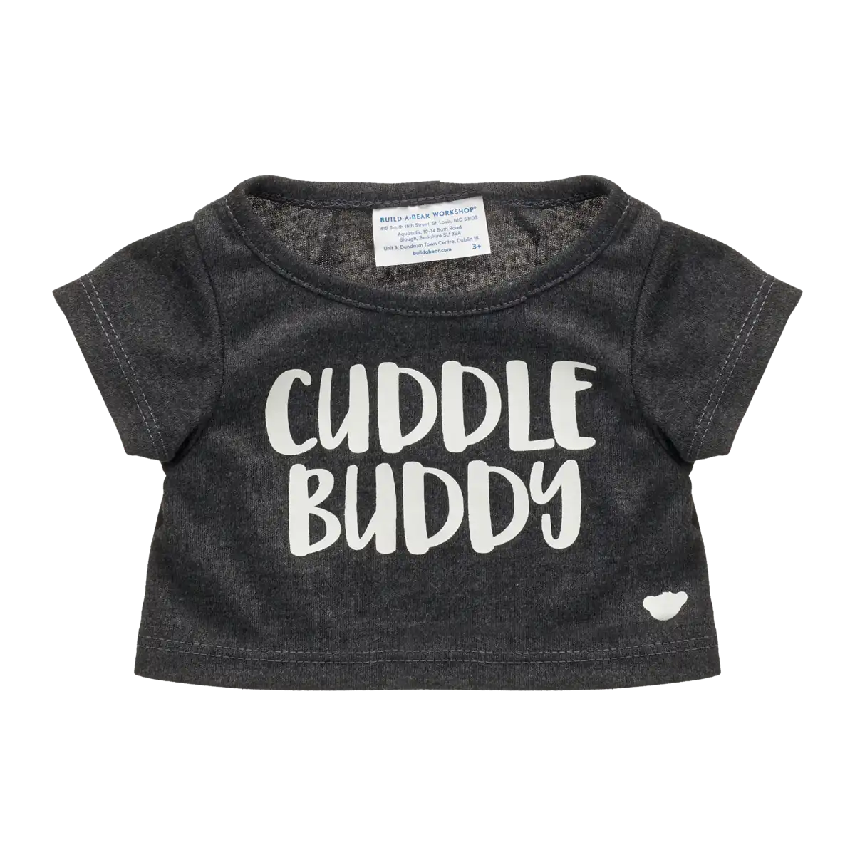 Giv din bamse et ekstra krammevenligt look med denne Cuddle Buddy T-shirt! Den bløde sort T-shirt har et sødt "Cuddle Buddy"-tryk på forsiden og passer perfekt til de fleste Build-A-Bear bamser.