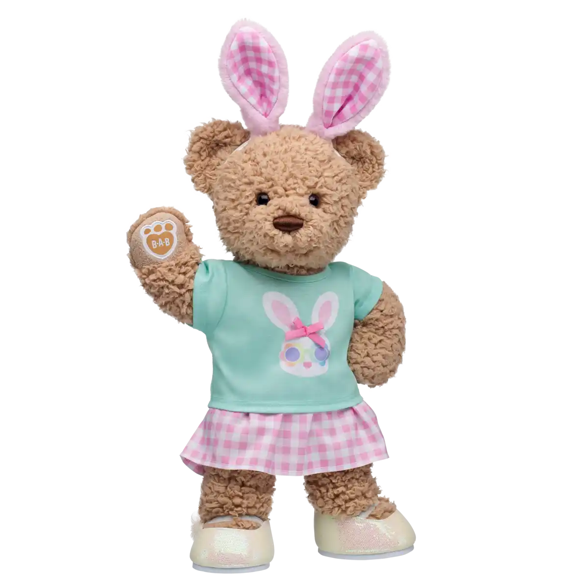 Med Gingham Bunny Skirt-sæt er din bamse klar til forårets magiske øjeblikke – fyldt med farver, kram og bamse-glæde.