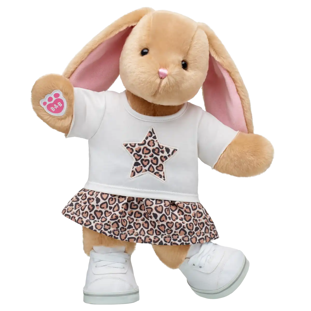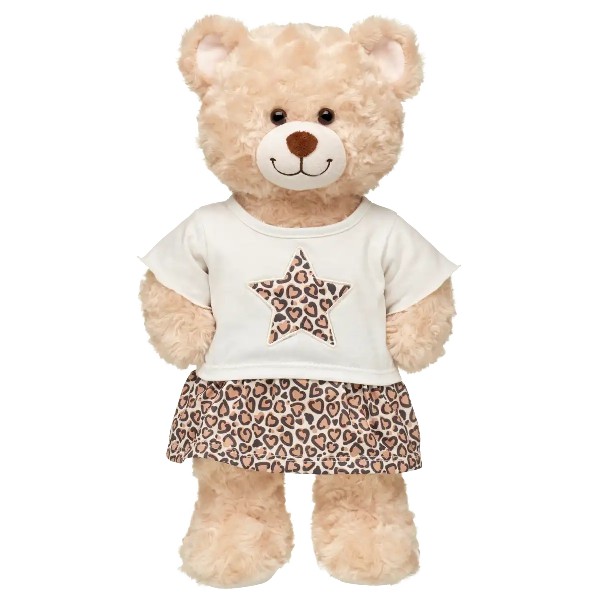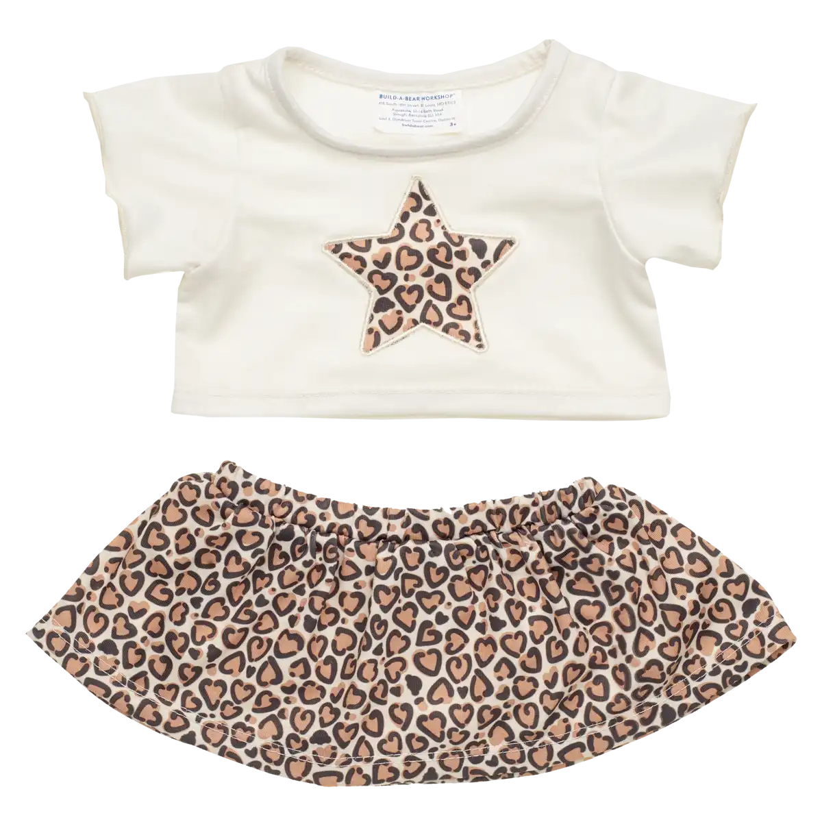 Vildt stylish! Giv din bamseven et bamset eventyr med vores Leopard-sæt med T-shirt og nederdel. Det fine to-delte sæt består af en blød, cremet T-shirt med et flot stjernemotiv i sej leopardprint – og en matchende nederdel, der svinger og danser ved hvert kram! Det er perfekt til bamser, der elsker flair, selvtillid og bamseballade.
